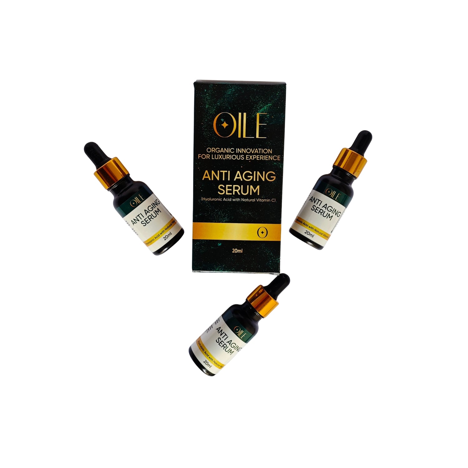 OILE Anti-Aging Serum — a powerful blend of natural botanicals (Vitamin C, Aloe Vera and Witch Hazel) and clinically backed ingredients. Reveal younger, glowing skin within just 7 days. This serum deeply hydrates, smooths fine lines, and restores your skin’s natural glow. Gentle, fast-absorbing, and perfect for daily use on all skin types